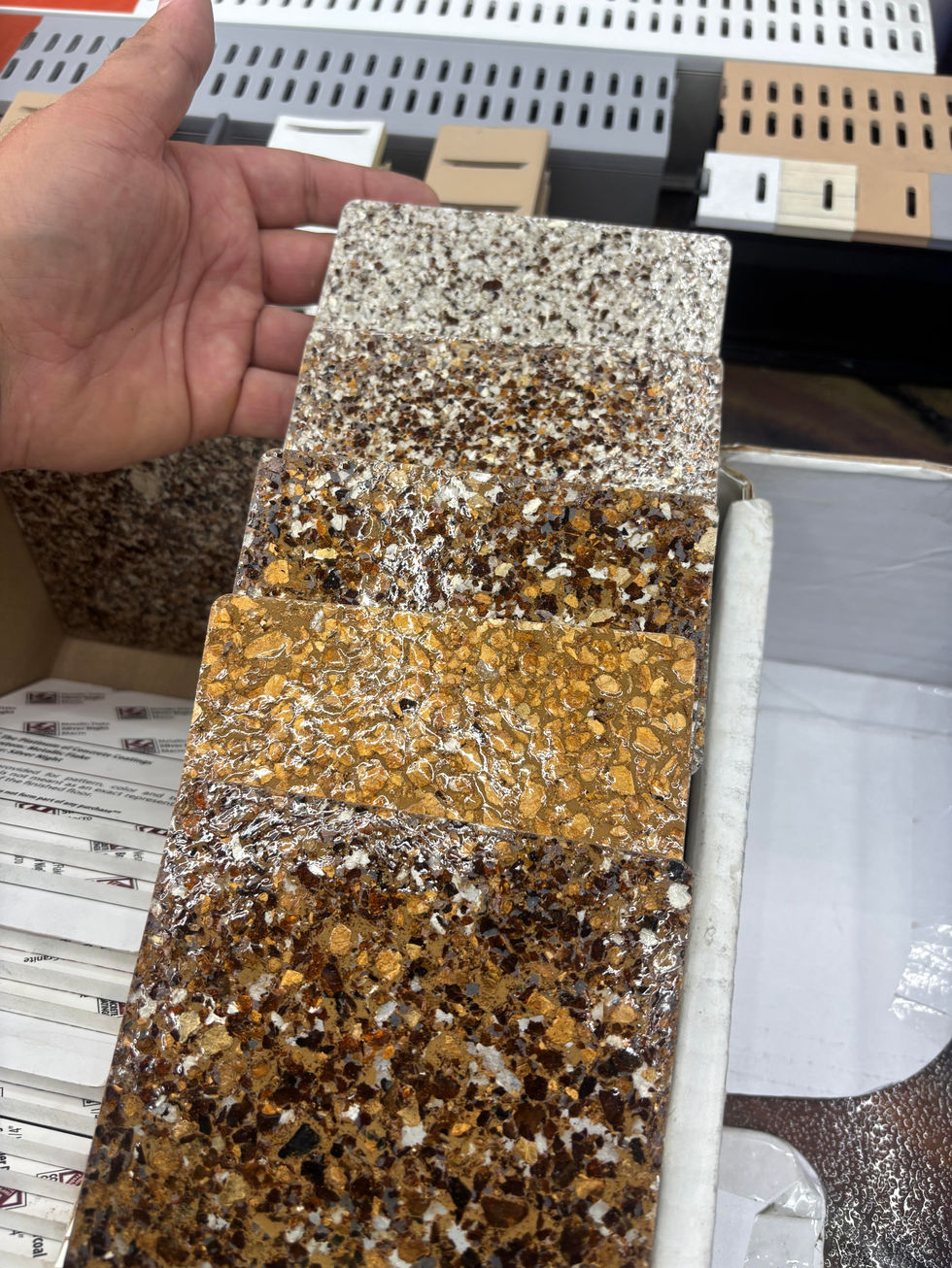 This project features a variety of concrete flooring samples in different colors and styles of flakes systems that we offer. From over 500 color options, and unlimited color combinations, the images showcase the diverse options available for epoxy flake systems. Durable, pressure wash safe, non-yellowing topcoat.